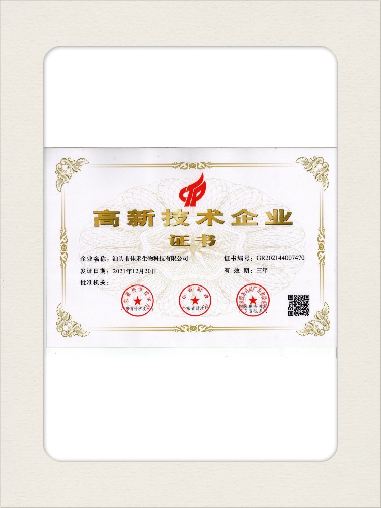 汕頭佳禾生物科技有限公司是一家致力于氨基酸及其衍生物研發、生產和銷售的國家高新技術企業,先后通過了國家藥品GMP認證,ISO9001質量體系認證、ISO14001環境管理體系認證。目前,公司擁有“廣東省專精特新中小企業”、“廣東省氨基酸產品工程技術研究中心”、“汕頭市生物發酵工程技術研究開發中心”、“汕頭市知識產權優勢企業”、“多項國家發明專利”、“廣東省守合同重信用企業”等多項資質和榮譽,旗下“佳禾牌”系列產品已成為原料藥行業知名品牌。 新泰市佳禾生物科技有限公司成立于2012年8月,注冊資金2億元,公司位于山東泰安新泰市新汶工業園區,是國 家級高新技術企業、山東省“專精特新”企業、山東省制造業單項冠軍企業、泰安市科技型中小企業、泰安市農業產業化龍頭企業、中國生物發酵產業協會理事單位。